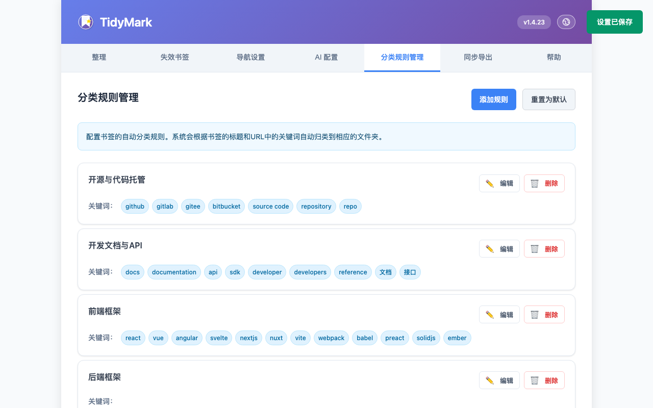 - 自动分类:按规则一键整理书签到对应类别。