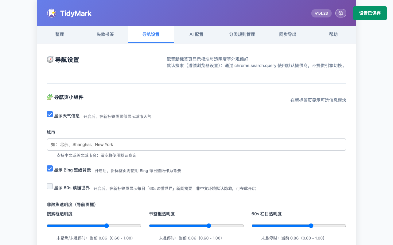 注意:安装完成后首次打开新标签页,浏览器可能弹出“是否保持由扩展设置的新标签页”的提示(Chrome/Edge)。如果你不需要导航页功能,请选择“拒绝 / 恢复默认”。这不会影响书签整理、分类、备份等核心功能,浏览器新标签页将保持默认样式。